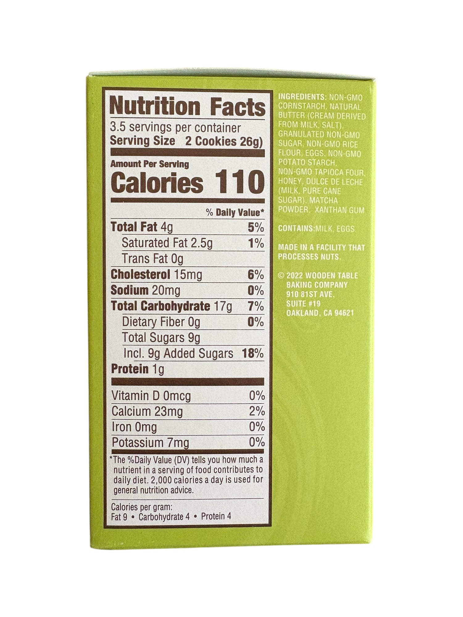 Ingredients: Non-GMO cornstarch, natural butter (cream derived from milk, salt), granulated non-GMO sugar, non-GMO rice flour, eggs, non-GMO potato starch, non-GMO tapioca flour, honey, dulce de leche (milk, pure cane sugar), matcha powder, xanthan gum.